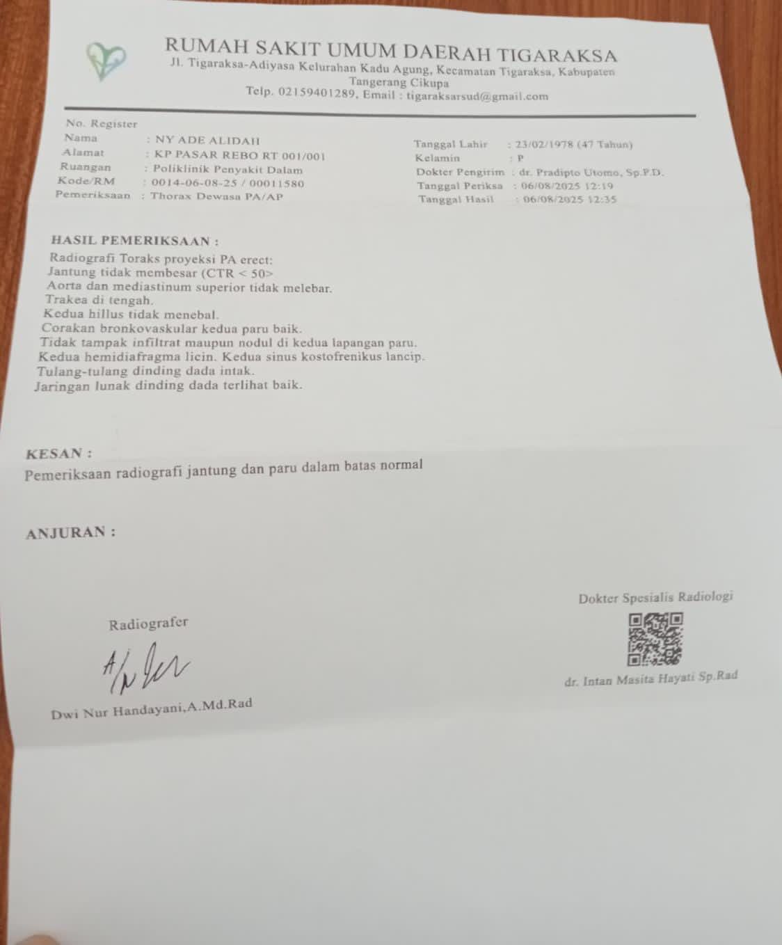 Saniman suami Almarhum Untuk hasil dari Rontgen tersebut Tidak Sesuai dengan penyakit yang di tujukan kepada (Almarhum) Ibu Ade Alidah masalah ini membuat saniman Sangat terpukul Juga kecewa, kepada pihak RS Umum tigaraksa Tangerang Atas kelalaian Oleh DR. Rian Juliansyah Perbuat.