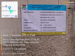 Sebagai informasi, kegiatan proyek Pekerjaan konstruksi Jalan beton di Perumahan Taman Raya RW 007, Desa Mekarsari, Kecamatan Rajeg, Kabupaten Tangerang, Yang bersumber Anggaran dari APBD Tahun Anggaran 2025 dengan total/ Jumlah Anggaran sebesar Rp 129.557.000,00.