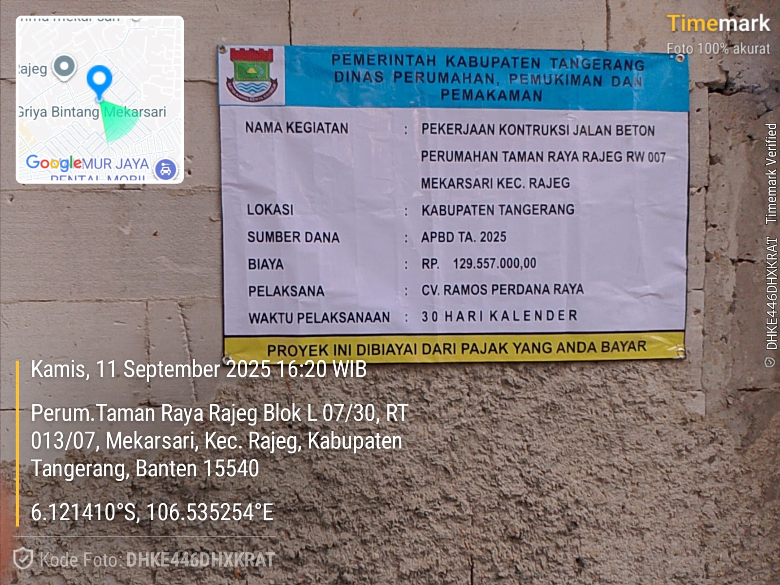 Sebagai informasi, kegiatan proyek Pekerjaan konstruksi Jalan beton di Perumahan Taman Raya RW 007, Desa Mekarsari, Kecamatan Rajeg, Kabupaten Tangerang, Yang bersumber Anggaran dari APBD Tahun Anggaran 2025 dengan total/ Jumlah Anggaran sebesar Rp 129.557.000,00.