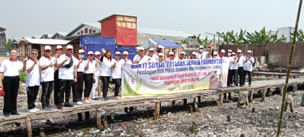 19 Juli 2025, Dalam rangka memperingati Hari Ulang Tahun ke-79 Republik Indonesia, Yayasan Servia Foundation bekerja sama dengan Gereja Jesus Christ Community (JCC) menyelenggarakan kegiatan Bakti Sosial (Baksos) bagi masyarakat terdampak Kebakaran di wilayah Kapuk Muara, Penjaringan, Jakarta Utara. Kegiatan ini dilakukan pada hari Sabtu, 19 Juli 2025 pukul 13.00 – 16.00 WIB, dengan pembagian 1.000 paket sembako, sumbangan 500 kantong pakaian layak pakai, dan makanan ringan bagi Anak Balita, Anak Sekolah, serta pengobatan gratis untuk warga.